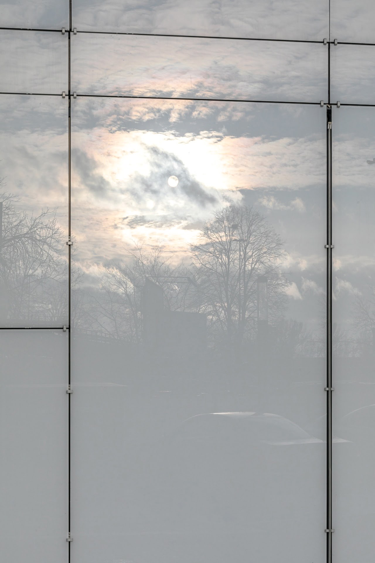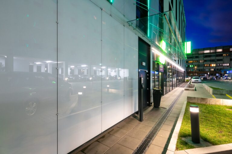 Aby osiągnąć ten cel, postawiliśmy na wykorzystanie szkła emaliowanego w kolorze RAL 9016, który dodaje elegancji i nowoczesności całej konstrukcji. Szkło to, z jego wybielonym i emaliowanym wykończeniem, nie tylko tworzy interesujące efekty świetlne w ciągu dnia, ale także w nocy ożywiane jest oświetleniem LED, które dodatkowo podkreśla geometryczne walory elewacji.